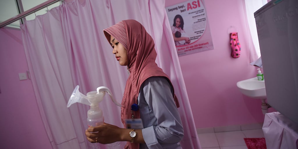 Crouched in a small, concrete toilet stall in a bustling garment factory in Indonesia’s Central Java province, Ririh unbuttons her floral blouse and takes out her manual breast pump. The space is neither comfortable nor particularly hygienic but she makes do.
