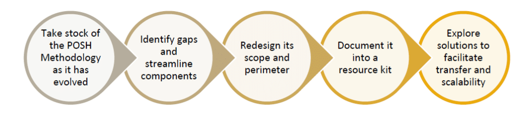 3 | Development of enhanced/streamlined methodology into a package/toolkit | Put together a coherent package of tools, resources and templates based on the enhanced / streamlined methodology. This might entail editing/ upgrading existing tools and/or creating new ones;Draft a synthetic manual or guide to accompany the package, with a view to facilitating transferring and replicating the methodology beyond the Nicaragua Better Work team.Integrate 1 round of feedback from Better Work working group. | Revised annotated inventory of POSH 2.0 package;POSH 2.0 manual. | 30 oct | 10 |