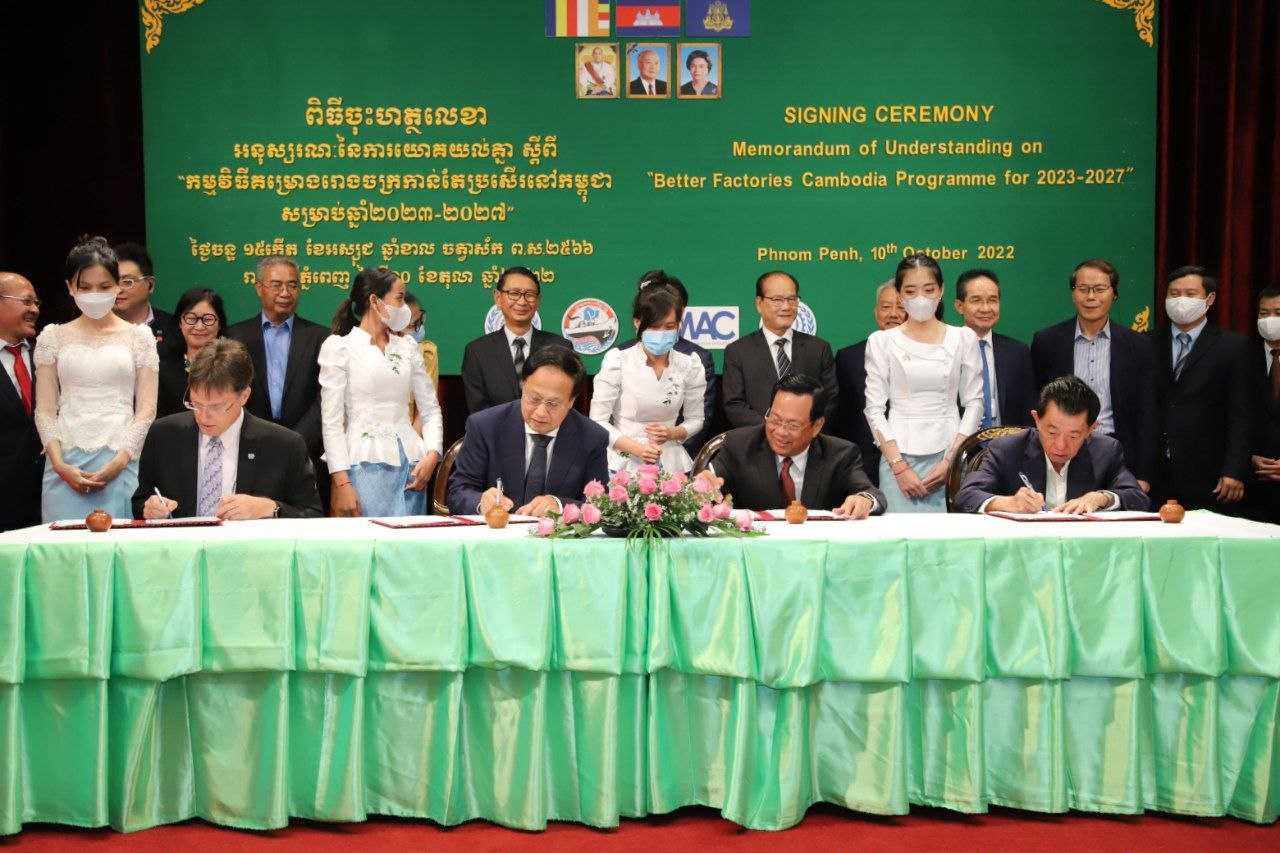 10 October 2022, PHNOM PENH, Cambodia – The Government of the Kingdom of Cambodia – represented by the Ministry of Labour and Vocational Training (MLVT) and the Ministry of Commerce (MOC) – the Garment Manufacturers Association in Cambodia (GMAC) and the International Labour Organization (ILO) have signed a new Memorandum of Understanding (MOU) to strengthen their partnership and extend the Better Factories Cambodia (BFC) programme for another five years from January 2023 to December 2027.