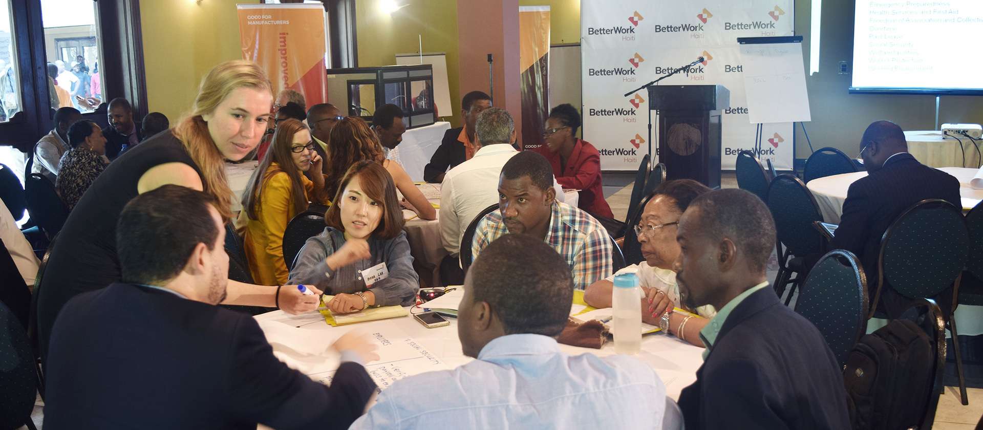 Port au Prince – In Fall 2016, Better Work Haiti held its 6th Buyer and Multistakeholder forum at Karibe Convention Center in Port-au-Prince, Haiti. It is a yearly event that unites international buyers, local suppliers, workers’ organizations, government officials and any other stakeholders. The objective of the meeting is to facilitate and encourage an open and honest dialogue about each party’s contribution to the program and its advancement and to share progress and plans for Better Work’s continuous improvement approach within the framework of its mandate. The event provides an opportunity for networking and to promote the Haitian textile industry to international partners.